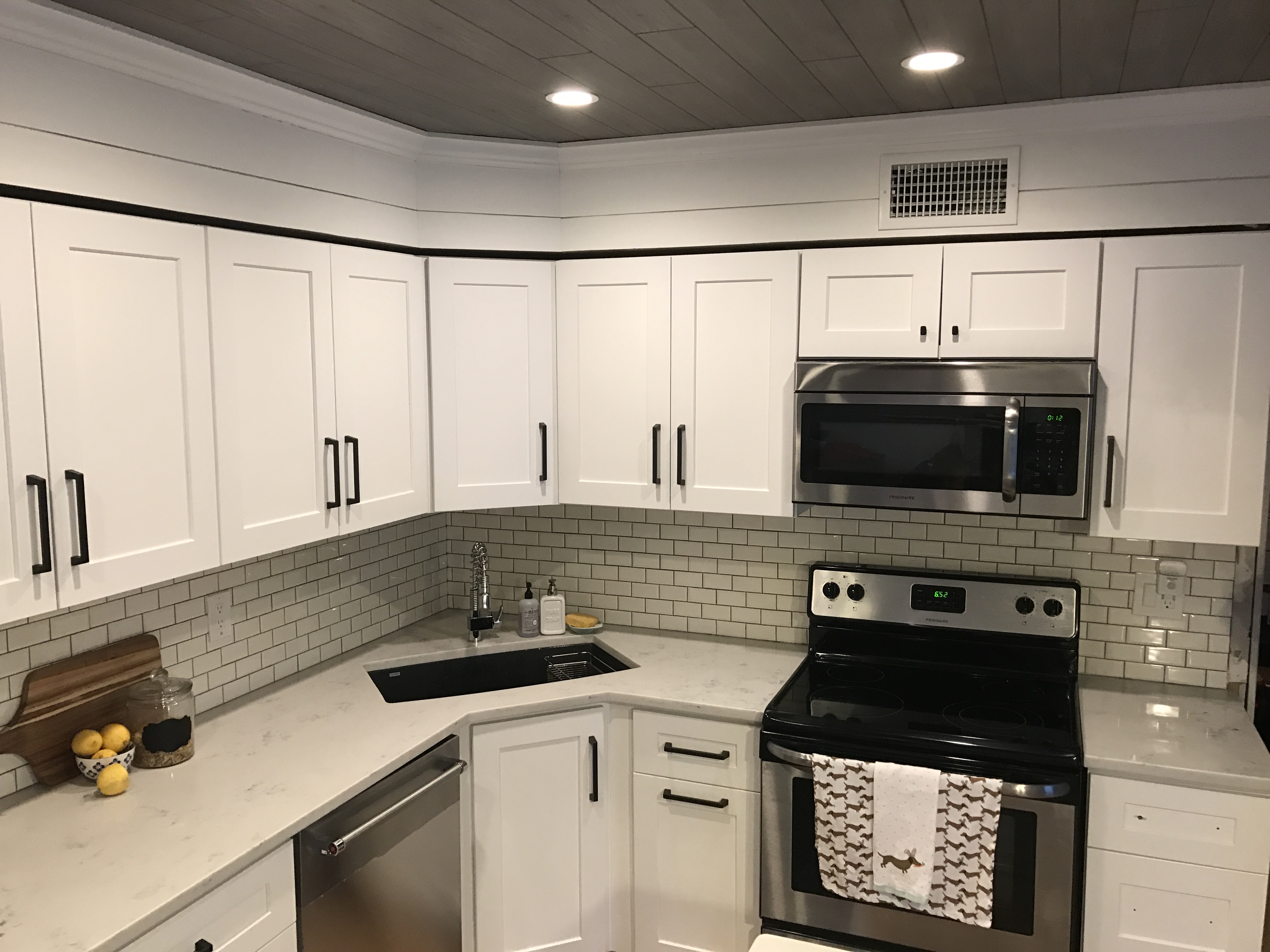 Island with hardware and new light fixtures.